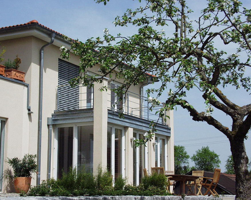 Systemorientierte Wohnhäuser mit flexiblen ebenerdigen Anbaumöglichkeiten: Garage, Werkstatt, Kinderwohnbereich, Lager, Büro. Im Klassisch-modernen Villenstil.